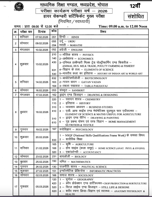 MP Board Class 10th 12th Time Table 2026, MPBSE Madhya Pradesh MP Board High School and Intermediate Exam 2026 Time Table / Date Sheet Download.