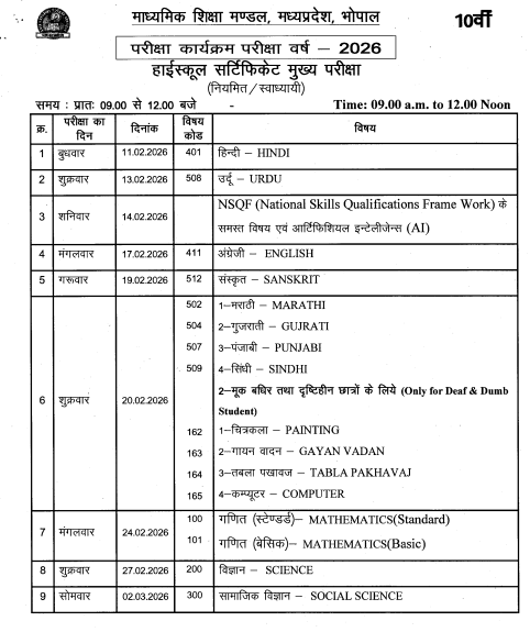 MP Board Class 10th, 12th Time Table 2026